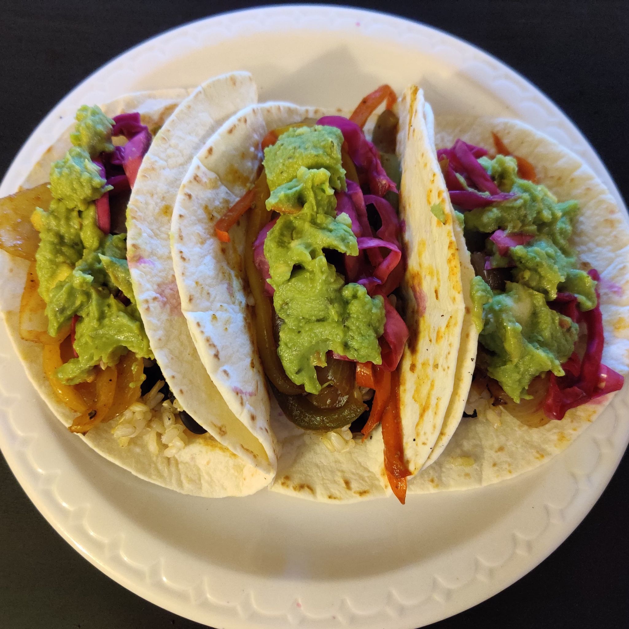 - To serve, add rice, beans, and vegetables to the tortillas and top with guac, pickled onion/cabbage, and lime juice. (note: you may also top with cilantro)
